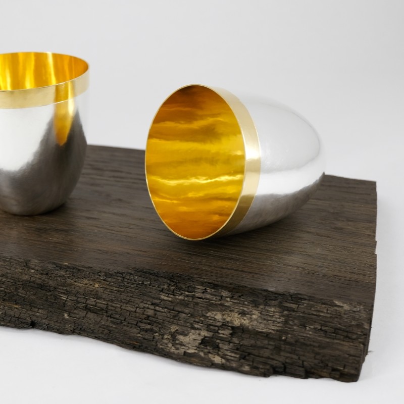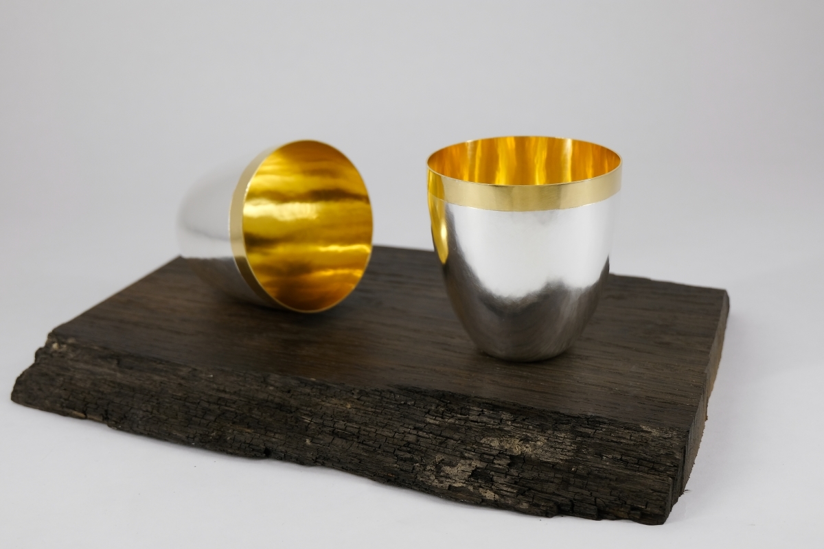 Die Brücke in die Zeit des 16. und 17. Jahrhunderts schlägt der Maßkrug mit einer klaren Eingrenzung der Außenfläche durch einen Sägeschnitt und eine Schattenfuge und dem Wechsel von matten und polierten Flächen. Hinter den Durchbrüchen liegt ein patinierter und überpolierter Strukturhammerschlag, der mit seiner Tiefenwirkung an fein gravierte und ziselierte historische Gestaltung erinnert.